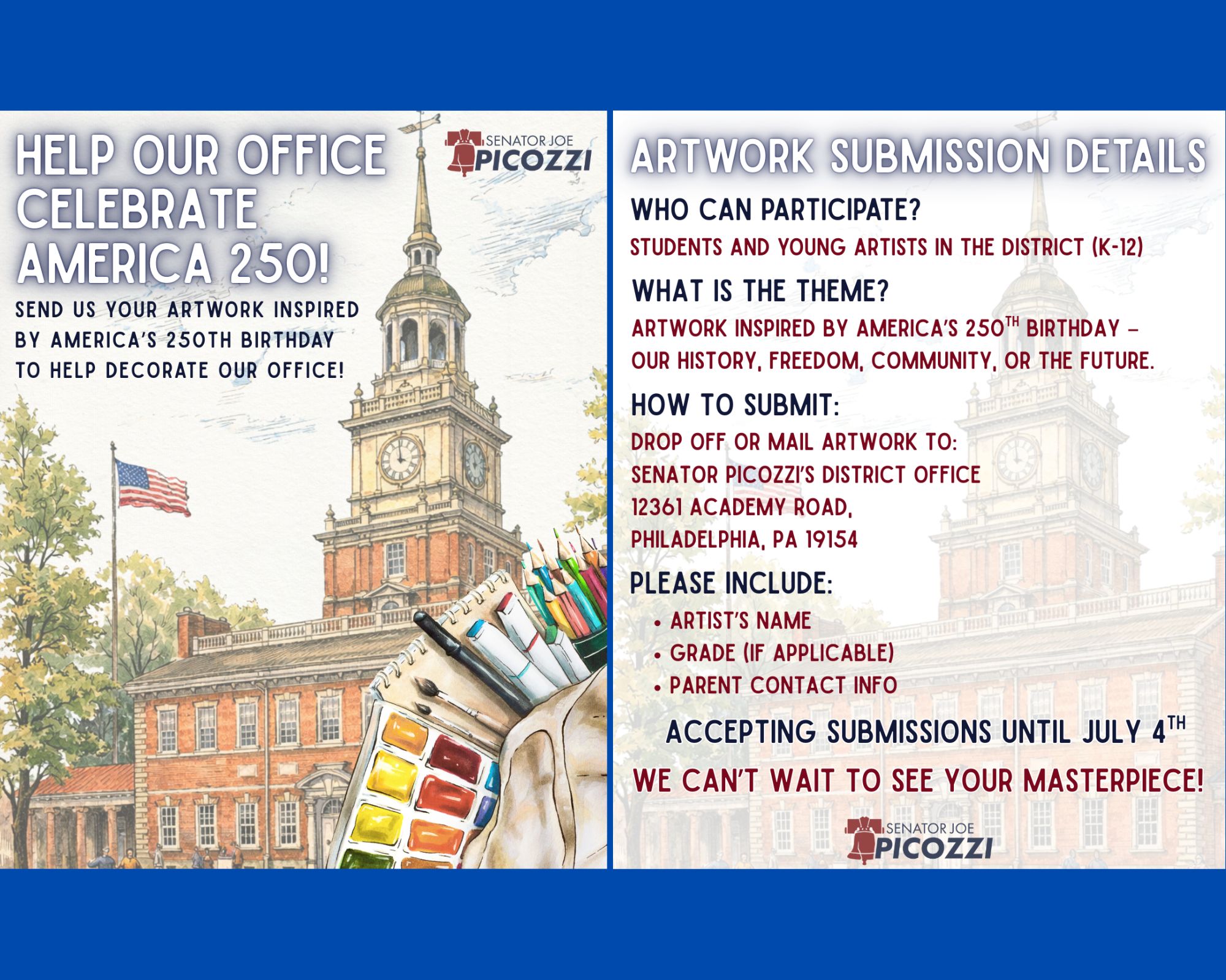 St. Matthew’s Parish Joins Us in Harrisburg!It was an honor to welcome Father Patrick Welsh of St. Matthew’s Parish in Mayfair to Harrisburg as our Guest Chaplin in the Senate. Father Welsh has been a dedicated leader in Northeast Philadelphia for years, faithfully serving his parish and strengthening the Church’s presence in our neighborhoods. From guiding St. Matthew’s Parish and School to his recent appointment from Archbishop Perez to Regional Dean of the Far Northeast, his commitment to service is clear. I also want to recognize his staff who joined us in the gallery; Social Media, Youth Group, and Music Director Vanessa Perrault, Office Manager Kaitlin Iavecchia, and Safe Environment Coordinator Dennis Corkery. I am thankful for the work they do each day in service to our community. I am always proud to see leaders from the Great Northeast represented in the Capitol. Thank you again, Father Welsh! Upcoming EventHelp Our Office Celebrate America 250!Senate Acts to Protect Workers’ Compensation for First Responders